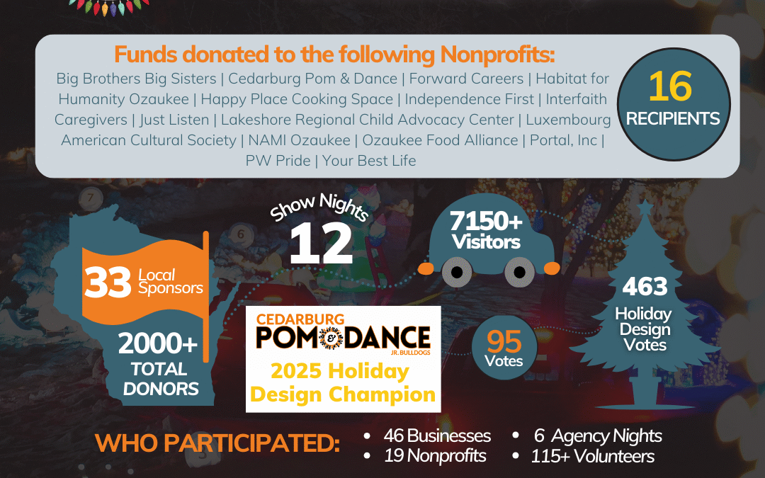 The Ozaukee Nonprofit Center has finalized the results from the 2025 Illuminate Ozaukee season, and the numbers reflect another year of strong community engagement and support for local nonprofits. The drive-through holiday light experience welcomed more than7,150 visitors over 12 show nights and engaged over2,000 donors. The event was made possible through the support of 33 local sponsors, 46 participating businesses, 19nonprofit partners, and more than 115 volunteers. Proceeds from the 2025 season were distributed to 16 local nonprofit organizations, helping strengthen programs that support mental health services, youth and family programs, basic needs, and other critical community resources across Ozaukee County. With this year’s distribution, Illuminate Ozaukee has now provided more than $61,000 back to local nonprofits since the event launched in 2020.“Each year, Illuminate Ozaukee demonstrates the power of community,” said Carissa Barnes, CEO of the Ozaukee Nonprofit Center. “The support we see from visitors, donors, sponsors, volunteers, and partners directly strengthens the organizations working every day to serve Ozaukee County. The impact extends far beyond the holiday season. ”The 2025 event transformed Zeunert Park with more than 100 kilowatts of holiday lighting and provided increased visibility and engagement opportunities for participating nonprofits. Photos from the season, including community impact graphics and check presentations to nonprofit partners, are included with this release. For more information about Illuminate Ozaukee or the Ozaukee Nonprofit Center, visit https://illuminateozaukee.org
