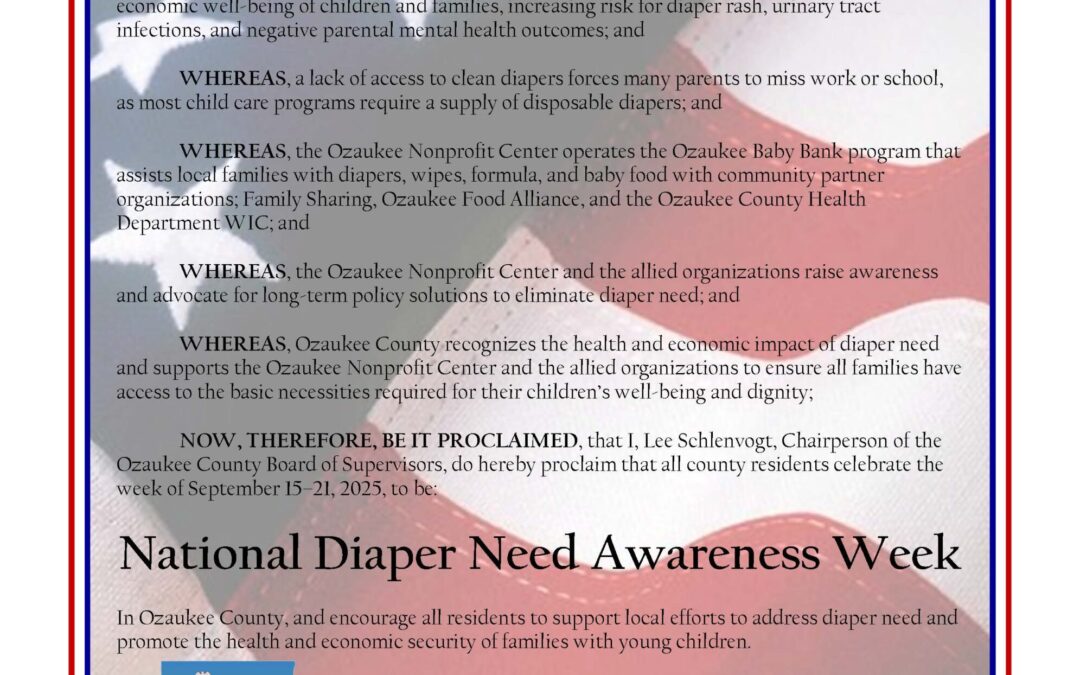 The Ozaukee County Board of Supervisors has officially proclaimed September 15–21, 2025, as National Diaper Need Awareness Week in Ozaukee County, recognizing the efforts of the Ozaukee Nonprofit Center (ONC) and its partners to support local families through the Ozaukee Baby Bank.