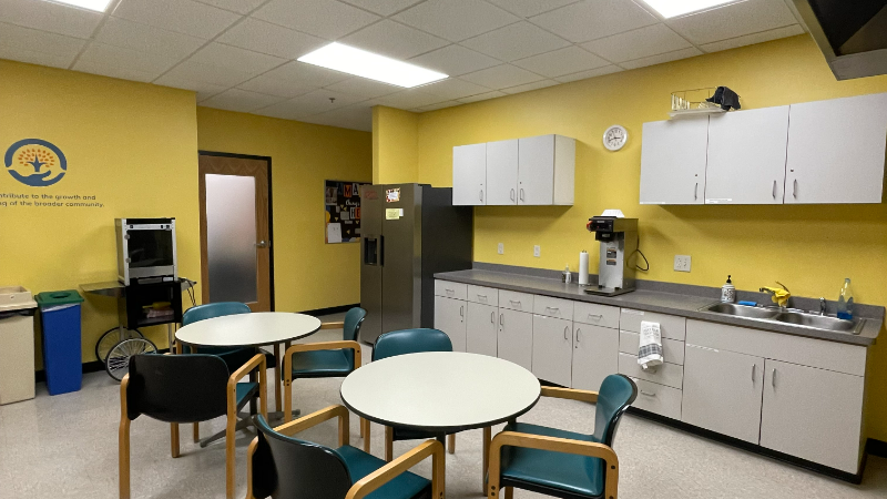 Our Community Kitchen can be rented for small gatherings and is equipped with a refrigerator, microwave, sink, and oven.